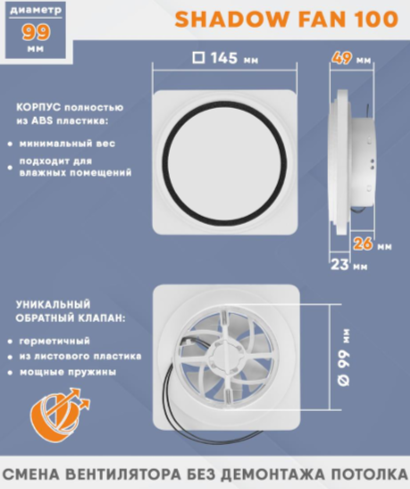 Высота теневого вентилятора всего 23 мм, а общая с обратным клапаном – 49 мм. Это позволяет рекордно высоко (!) устанавливать Ваш натяжной потолок, экономя драгоценные сантиметры.